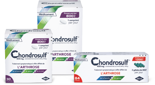 Médicament. Chondrosulf® est un médicament à base de chondroïtine sulfate. Chondrosulf® 800 mg est réservé à l’adulte, pas avant 18 ans. Ces médicaments ont une action lente, retardée d’environ 2 mois et leur effet peut persister après l’arrêt du traitement. La prise en charge de l’arthrose repose avant tout sur la mise en place de mesures hygiéno-diététiques (réduction d’un surpoids, activité physique régulière – en dehors des poussées douloureuses où la réduction de l’activité est nécessaire) en complément de kinésithérapie, port d’orthèses ou utilisation de cannes. Lire attentivement la notice. Demandez conseil à votre pharmacien. Si les symptômes persistent, consultez votre médecin. Déclarer un effet indésirable suspecté via le système national de déclaration : https://signalement.social-sante.gouv.fr/